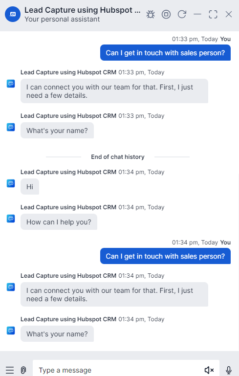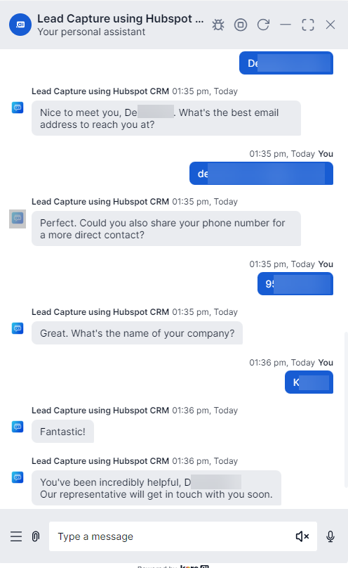 Enter all lead details when prompted by the Chatbot, as shown below: