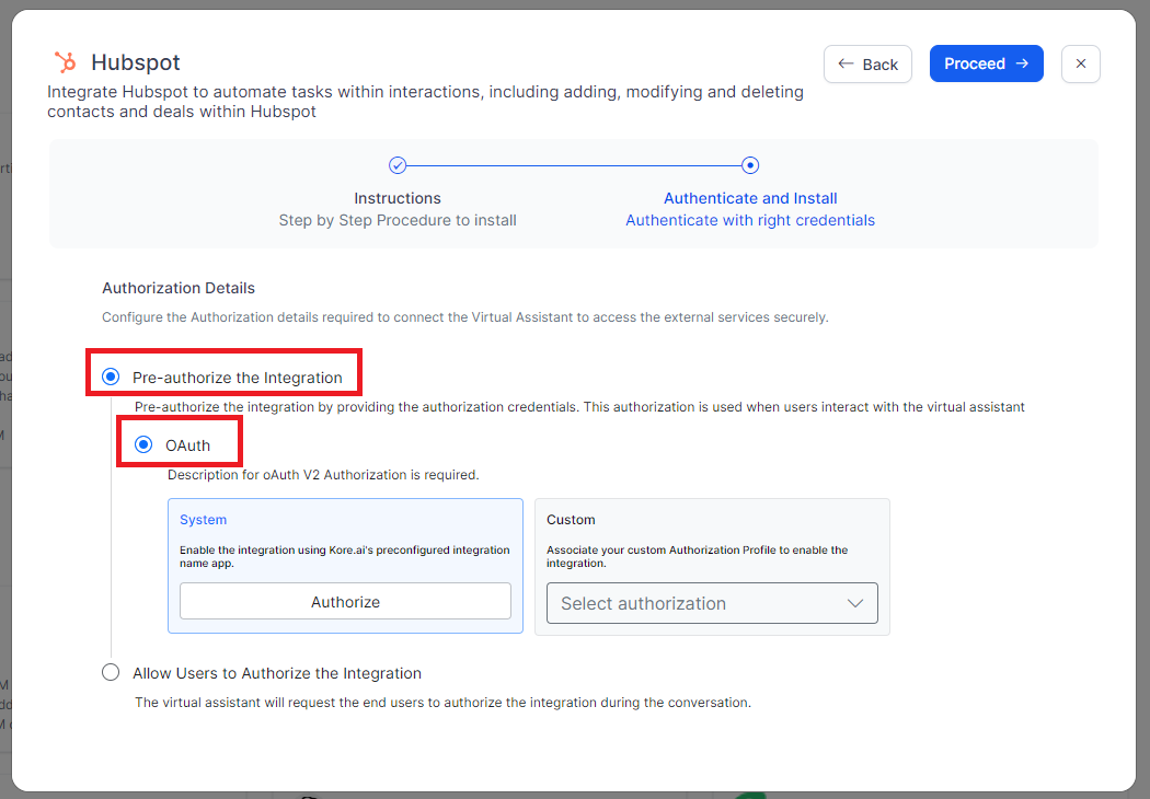 Select System to enable the Kore.ai’s preconfigured HubSpot app and click Authorize.
