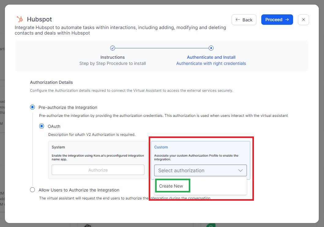 Create your own custom authorization profile to obtain an access token and use it to complete integration without using Kore.ai’s HubSpot app for authorization.