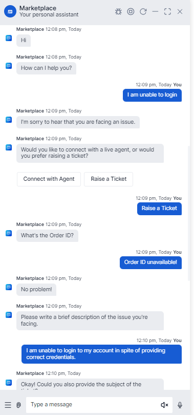 You can streamline your customer support experience with our AI chatbot. Your end-users interact with the chatbot to resolve their queries. The assistant can tackle straightforward questions directly in the chat, saving users time and effort. For complex issues requiring more time or expertise or during non-office hours, the assistant can effortlessly guide users in creating a Zendesk support ticket. It can prompt users to collect the required information and create a ticket or convert the ongoing conversation into a ticket, keeping the conversation context in mind.