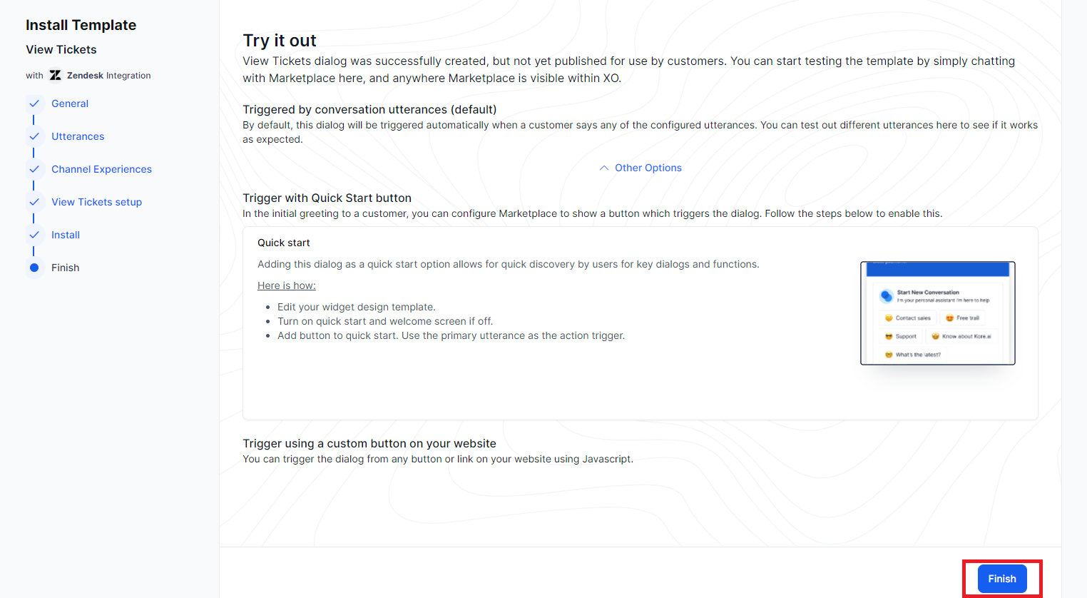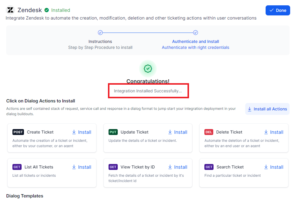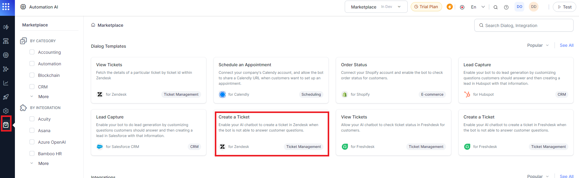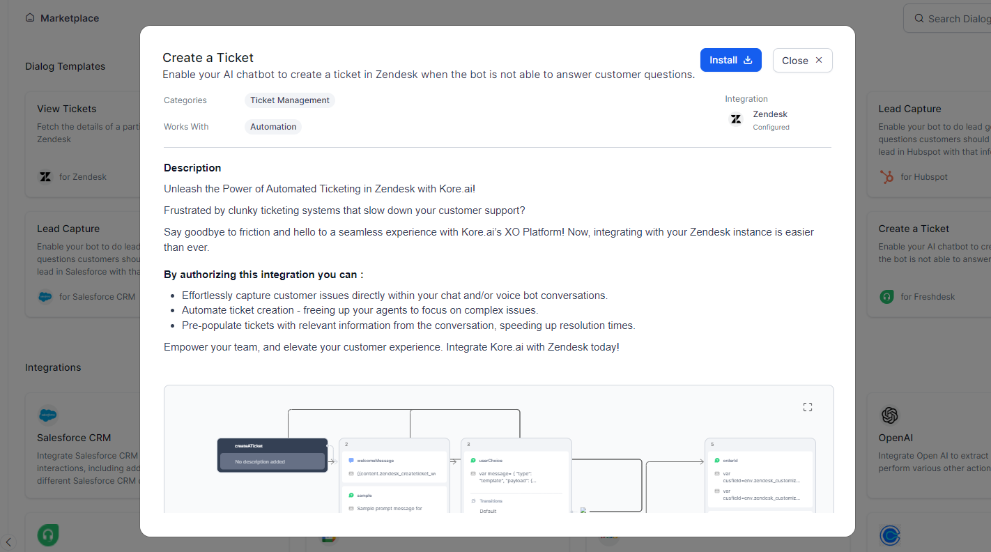 Go to the Marketplace and select Create a Ticket for Zendesk Dialog Template.