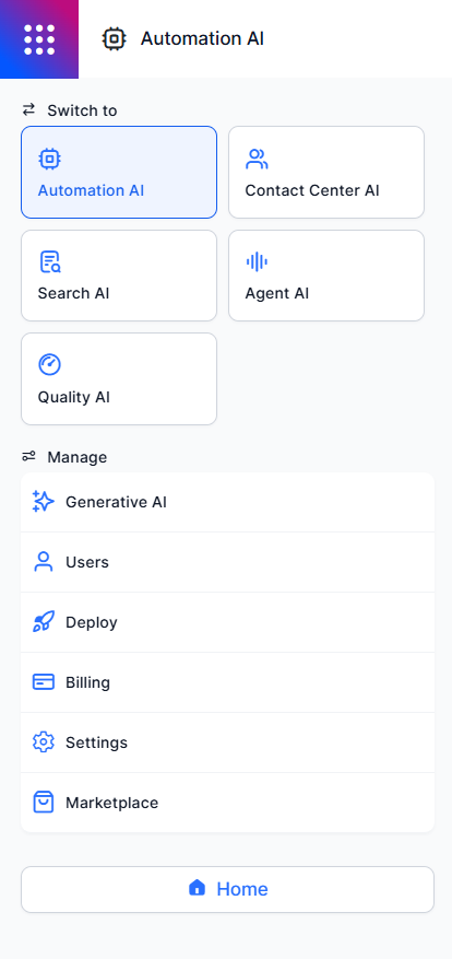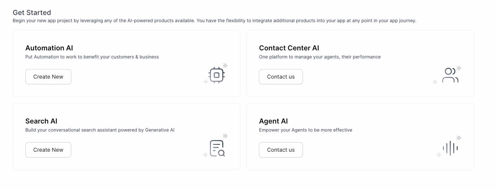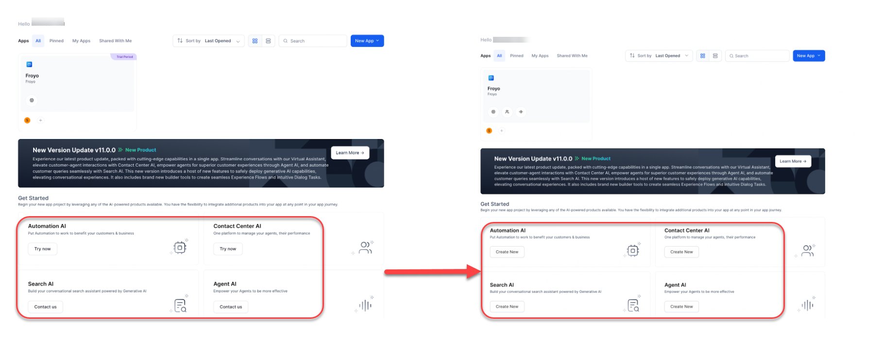 Once the upgrade is completed, users gain immediate access to the eligible products without needing to go through the trial flow again. For example, Automation and Contact Center AI show the Try Now buttons before the upgrade. After the upgrade, they are shown as Create New. Similarly, the Contact Us buttons are replaced with Create New for Search AI and Agent AI.