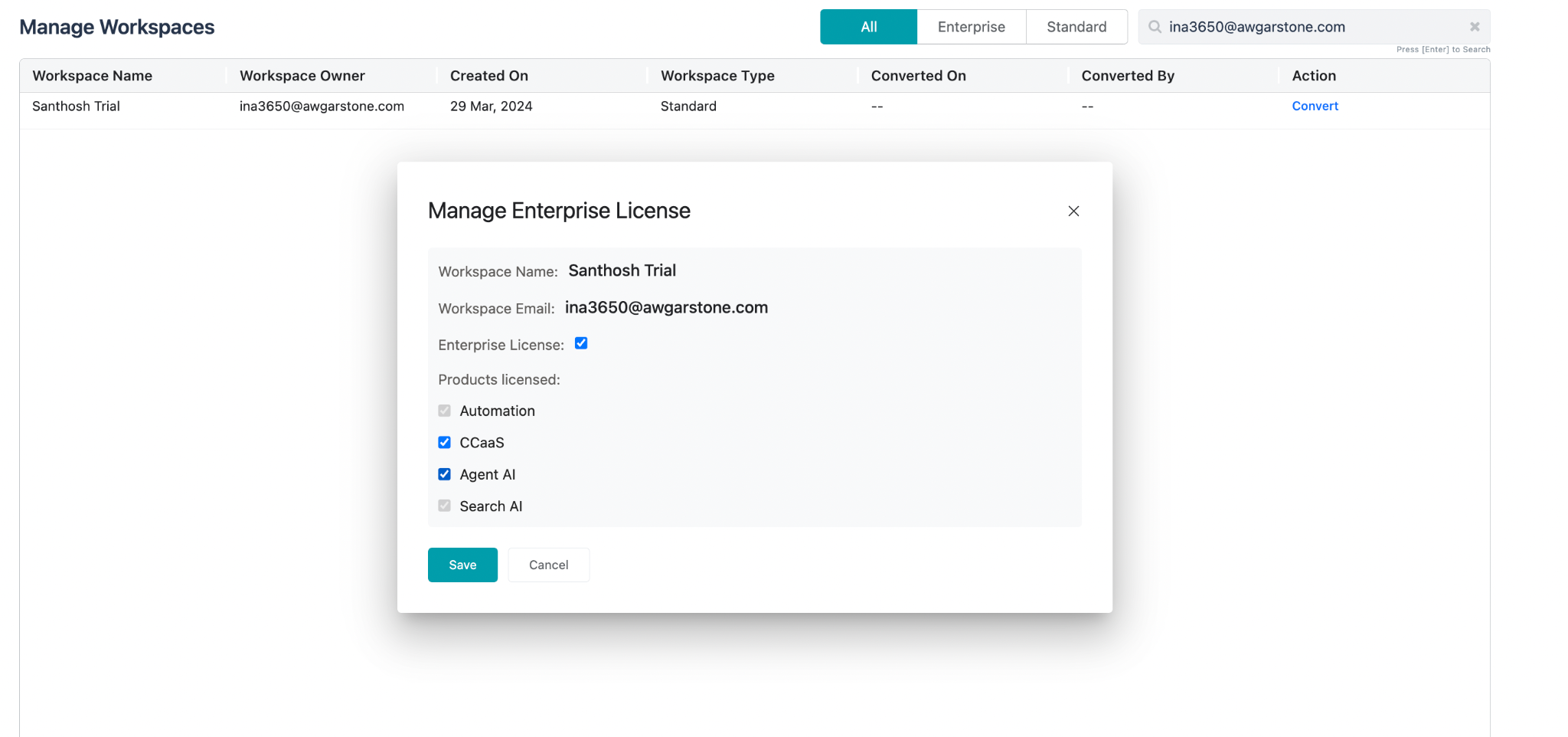 When upgrading to an enterprise workspace, the upgrade applies only to specific products. For example, if a customer purchases only Search AI, the workspace will be upgraded only for the Search AI license. Access to other products is not granted.