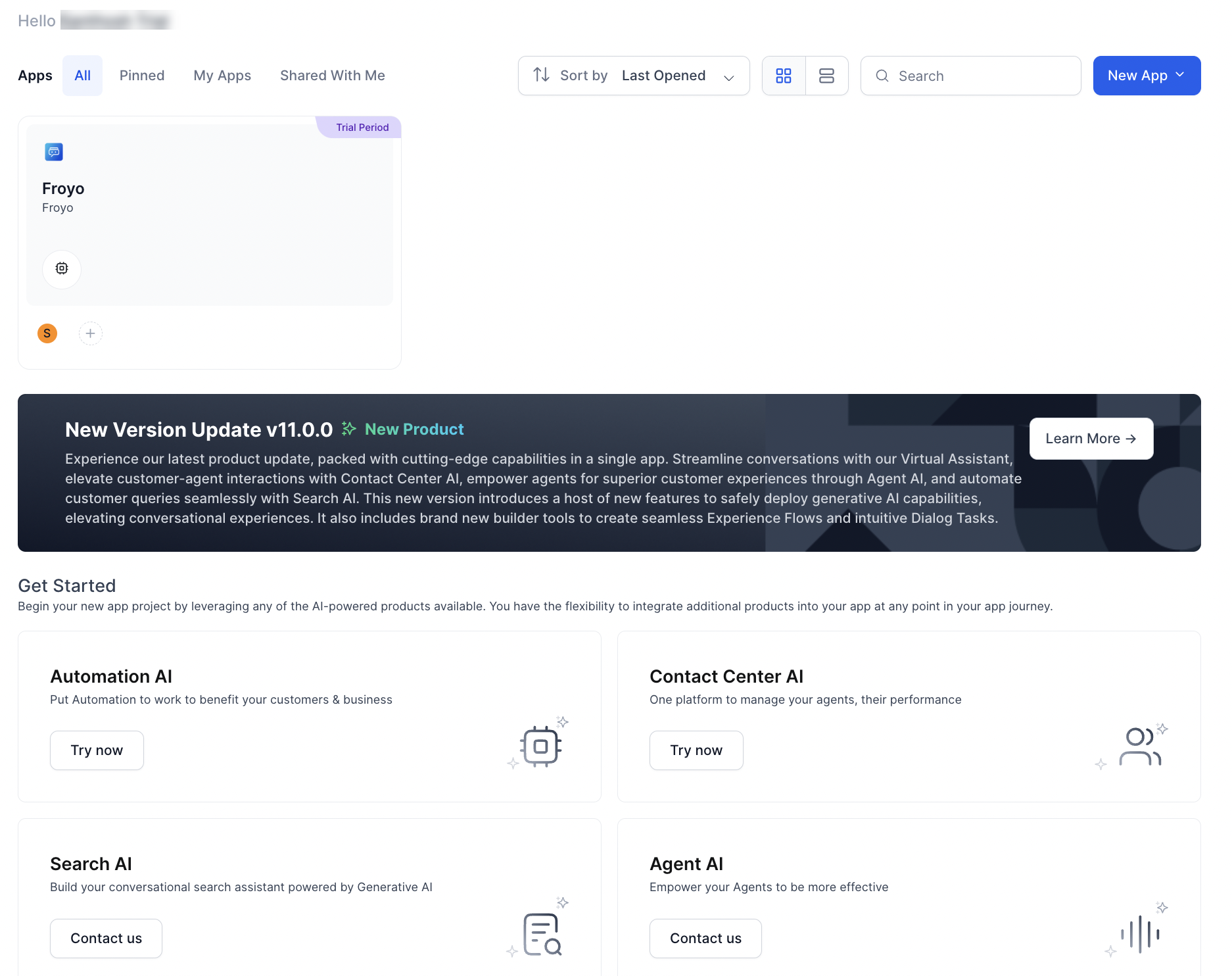 - Example: User A can create App1 with Automation AI trial, then switch to Contact Center AI trial.