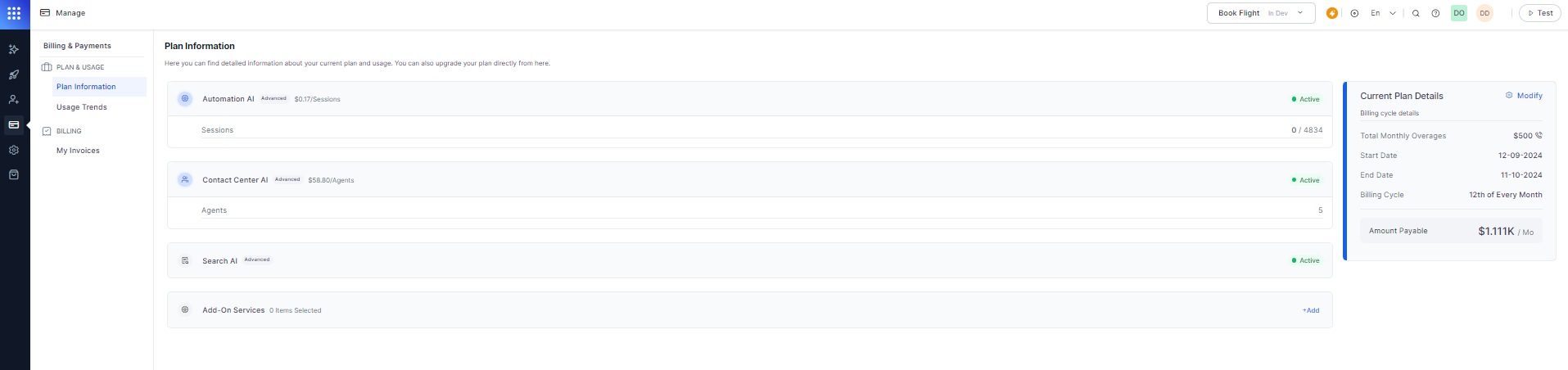 Plan and Usage help you manage your apps and workspaces while keeping track of their periodic billing and usage. The Plan Information section provides information on your current plans for all the products. You can also view your billing cycle, modify your current plans, and compare them from here. On the analytics-driven Usage Trends dashboard, you can monitor the usage patterns of your App Interactions with customers.