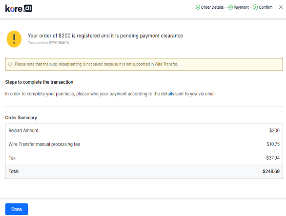 Select the wire transfer payment mode while adding funds. A wire transfer is a form of electronic payment that sends money directly from one bank account (Payer) to another (Payee).