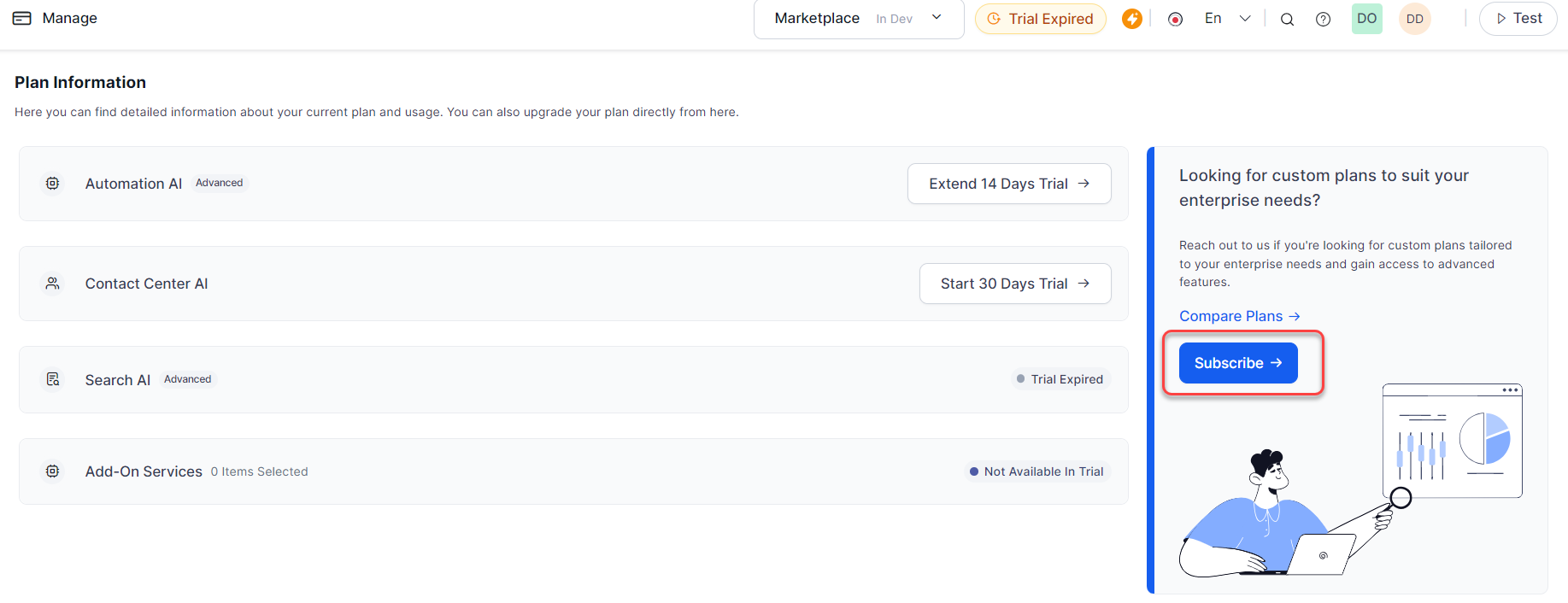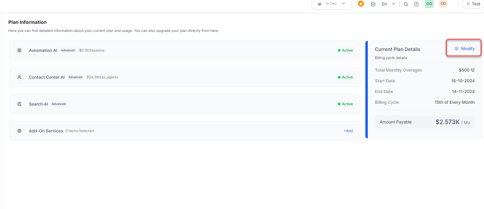 Here, you can find detailed information about your current plan and product usage. You can also modify or upgrade your plan directly from here.