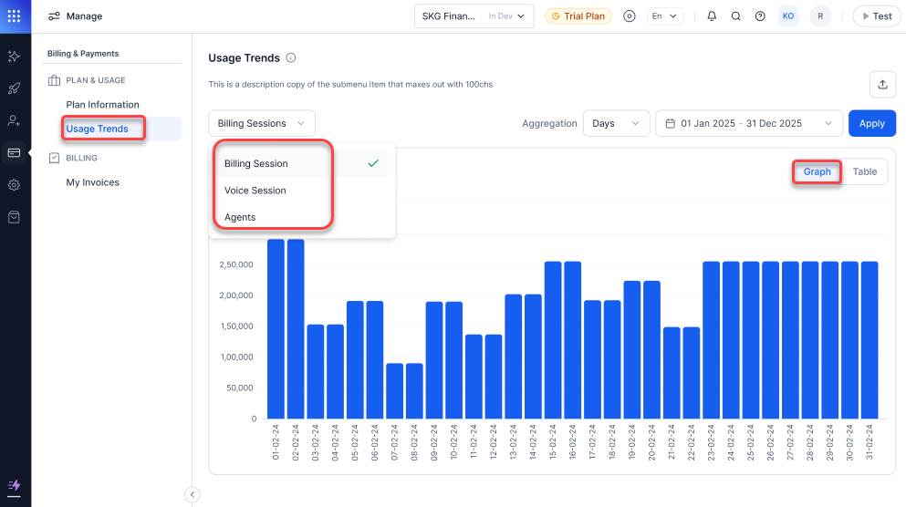 This section allows app users to access detailed billing information, helping them stay informed about their expenses and effectively track Apps’ usage. The dashboard provides a consolidated view of cumulative billing data, including Billing sessions, voice sessions, and agent counts.