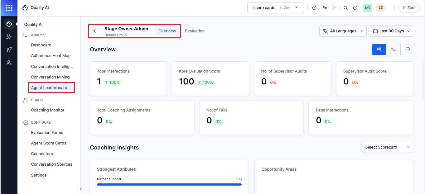 This provides a personalized dashboard for each agent, accessible to both agents and supervisors. Supervisors can review key performance metrics filtered by language, date, and channel, identify coaching opportunities, and assign targeted coaching to improve individual agent performance.