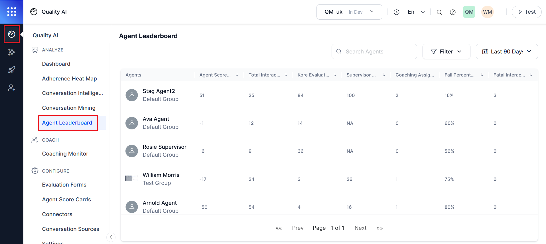 Sort: This allows to sort agents by metrics, such as Agent Scorecard, Total Interactions, Kore Evaluation Score, Supervisor Audit Score, Coaching Assignments, and Fail Percentage to identify top or bottom performers.