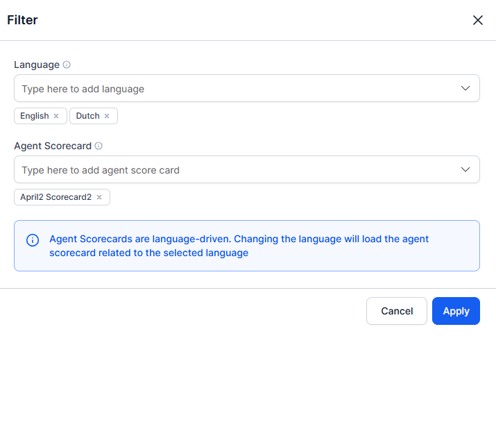 Filter: This allows you to filter more than one scorecards based on the selected language.