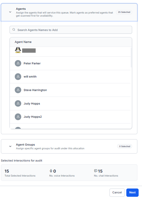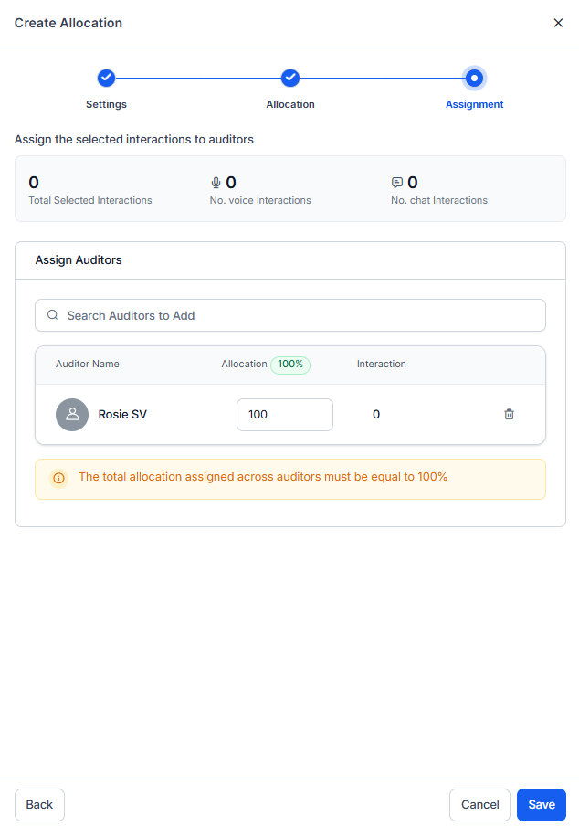 Enter the Allocation Percentage for each selected auditor. The percentage determines what portion of the total interactions each auditor receives.