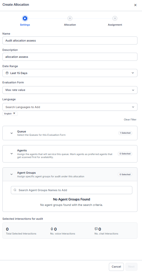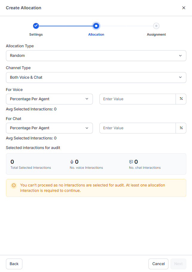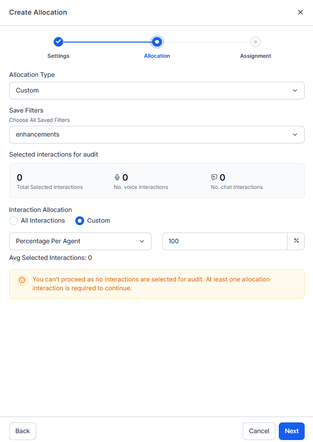 The Assignment step completes your allocation by distributing the selected interactions across your auditor team. This final configuration ensures balanced workload distribution and activates the allocation for evaluation.