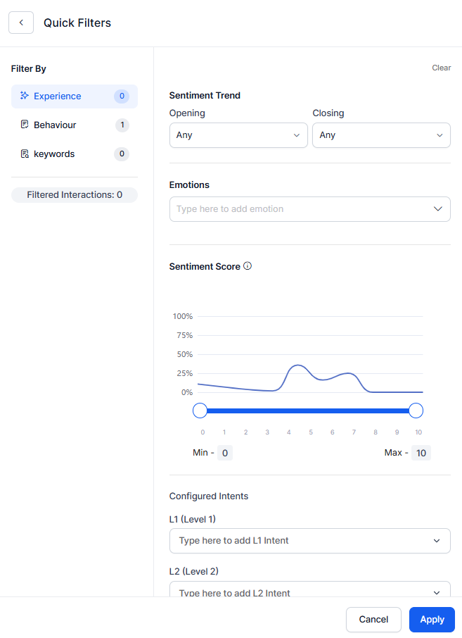 Experience Filters: Target interactions based on customer experience metrics, including sentiment trends from opening to closing, emotional indicators, average waiting time, sentiment scores, Customer Satisfaction Score (CSAT) ratings, detected intents, conversation topics, and churn risk indicators.