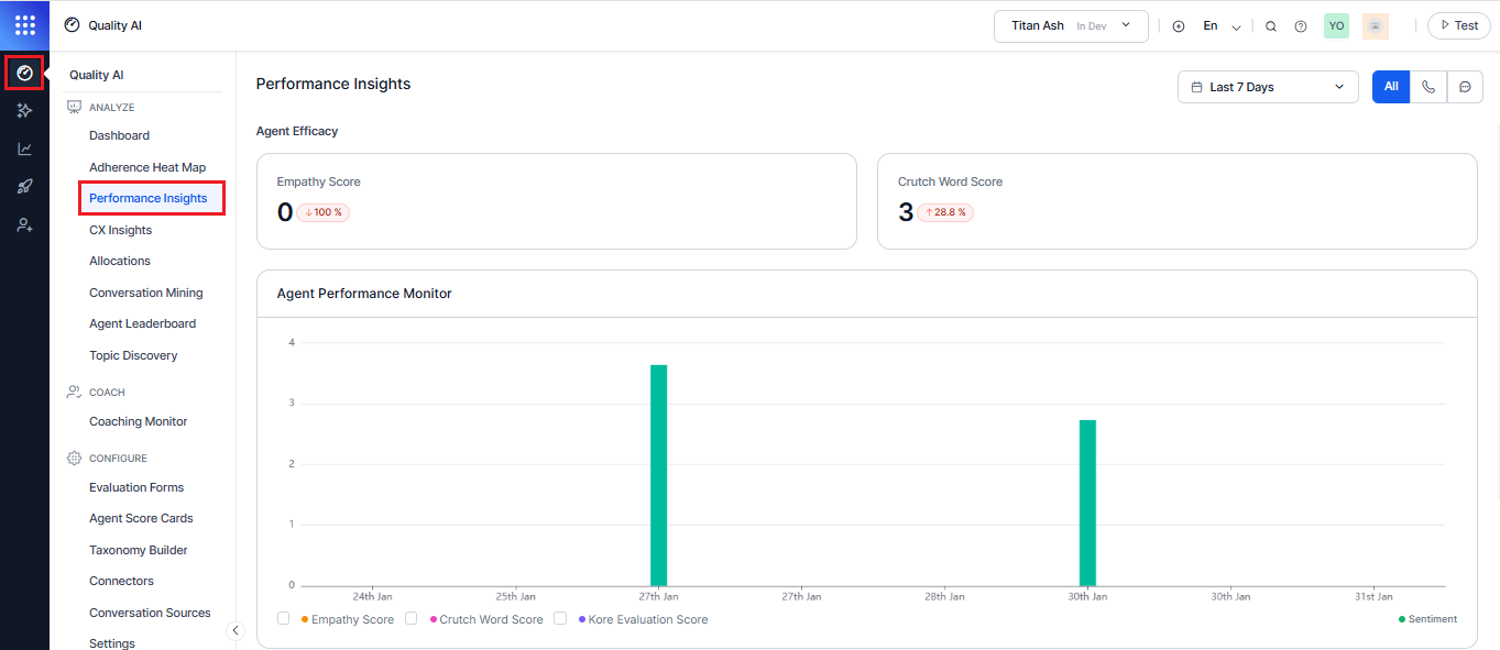 The Performance Insights view provides a focused analysis of agent communication quality and behavioral trends over time. It helps quality managers and supervisors monitor key conversational performance indicators, identify improvement opportunities, and take targeted coaching actions using data-driven insights.