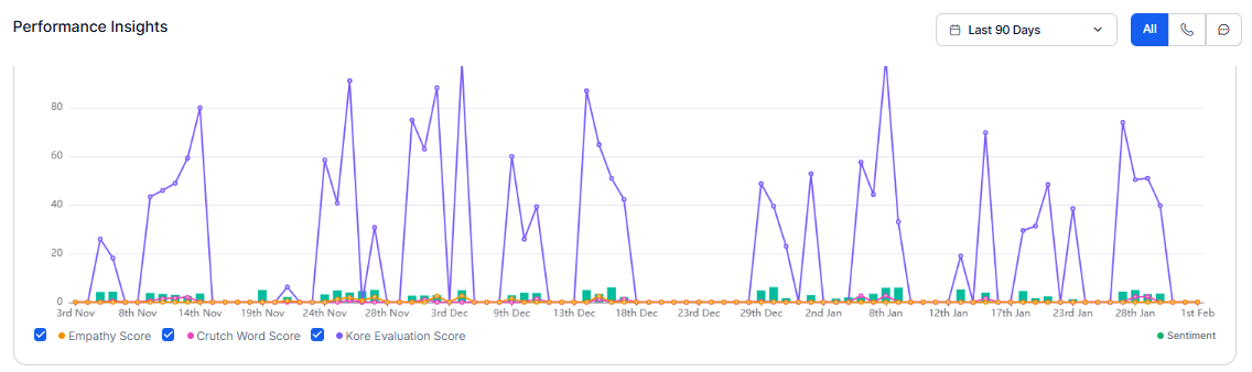 The Agent Performance Monitor now includes a trend line for the Kore Evaluation Score, enabling comprehensive quality assessment alongside existing performance metrics.