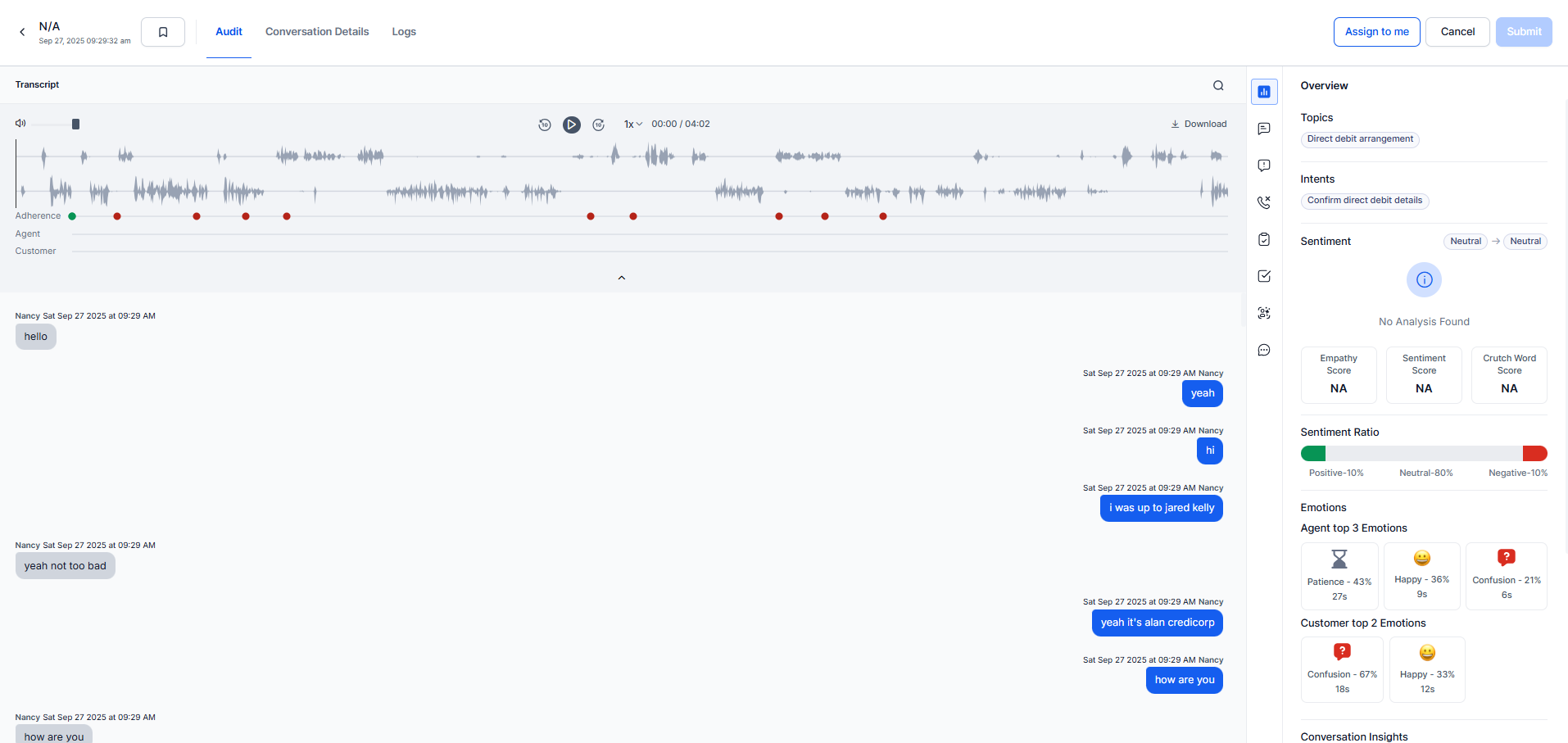 The full conversation view pane provides a comprehensive, immersive experience for analyzing individual customer interactions. This detailed interface combines the complete conversation thread with contextual metadata, analytical insights, and visual indicators to help you understand what happened, why, and how it can tell future improvements.
