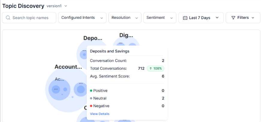 The dashboard presents topics as bubbles on an interactive canvas, with each bubble colored by the selected metric—sentiment or resolution—providing a clear view of topic performance across conversations and allowing users to identify high-and low-performing topics.