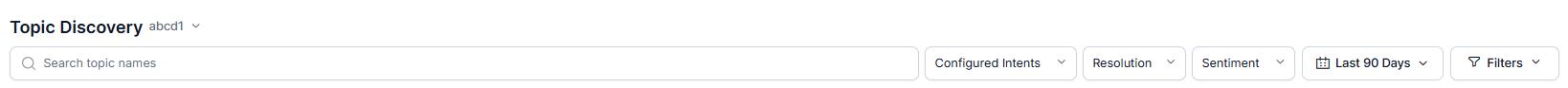 The Top Filter Bar is your central control panel for customizing what you see in the Topic Discovery dashboard. It enables you to refine results, switch perspectives between configured and AI-generated intents, and focus on specific time periods or performance metrics.