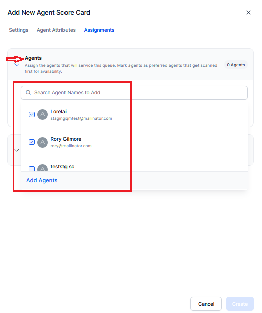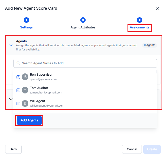 In the Agents, assign scorecards across the required agent by searching an Agents name, and select Add Agents to add agent names.
