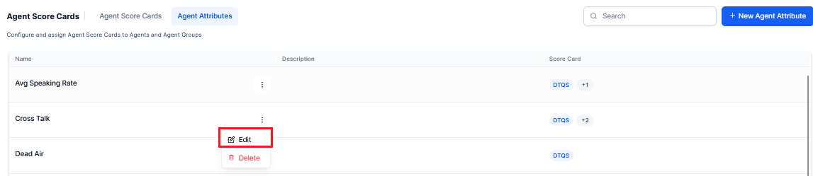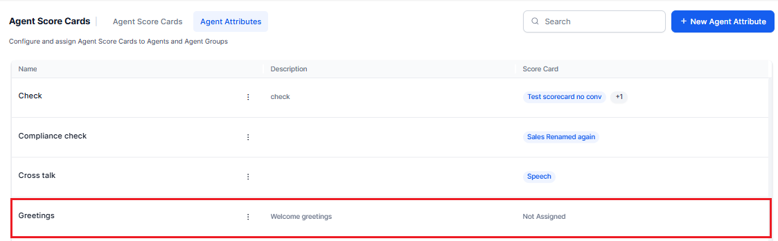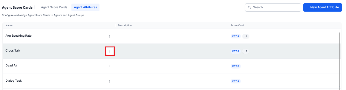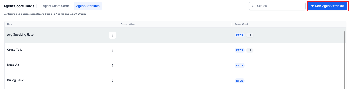 From the Agent Score Cards, select the Agent Attributes > +New Agent Attribute.