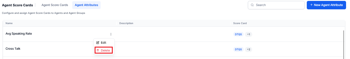 Agents cannot delete any attributes already assigned to a scorecard. To delete an attribute, the agent must first remove it from the assigned scorecard. Only unassigned attributes can be deleted. Deleting an attribute also removes all data associated with it.