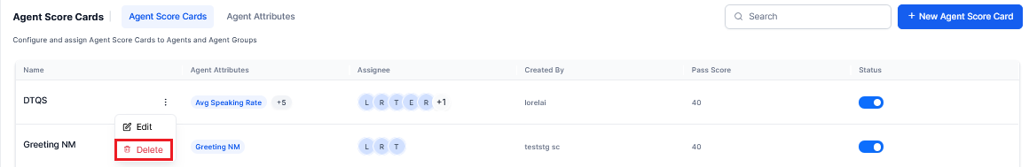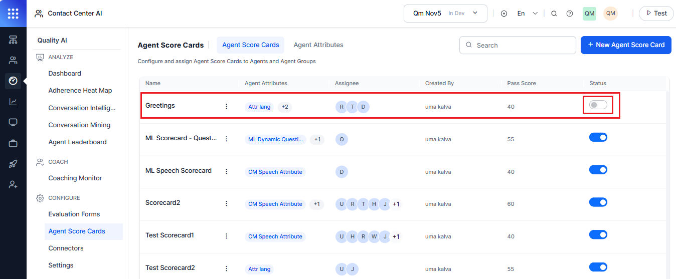 Select Create. The system adds the new scorecards created for the agent or agent group. Enable the status toggle to start agent-level scoring based on that scorecard.