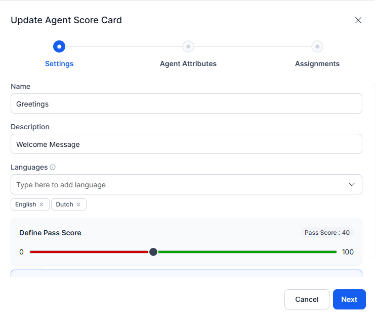 Enable the Mark as Default toggle to assign the scorecard to all agents. By default, the system enables this toggle for the first scorecard you create. Configure the pass score (default: 40).