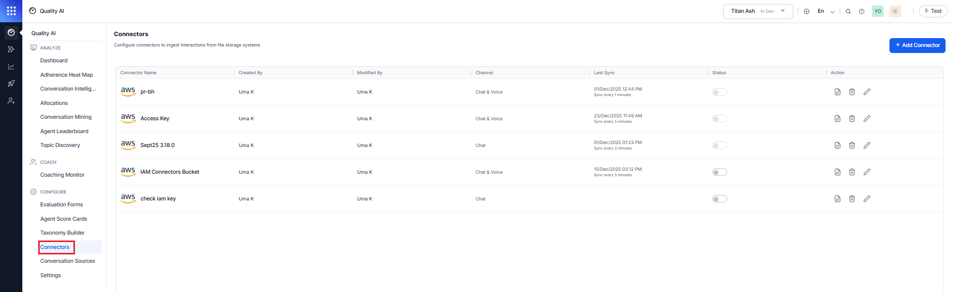 Connectors act as the primary bridge for importing conversations into Quality AI through AWS S3 file transfers.