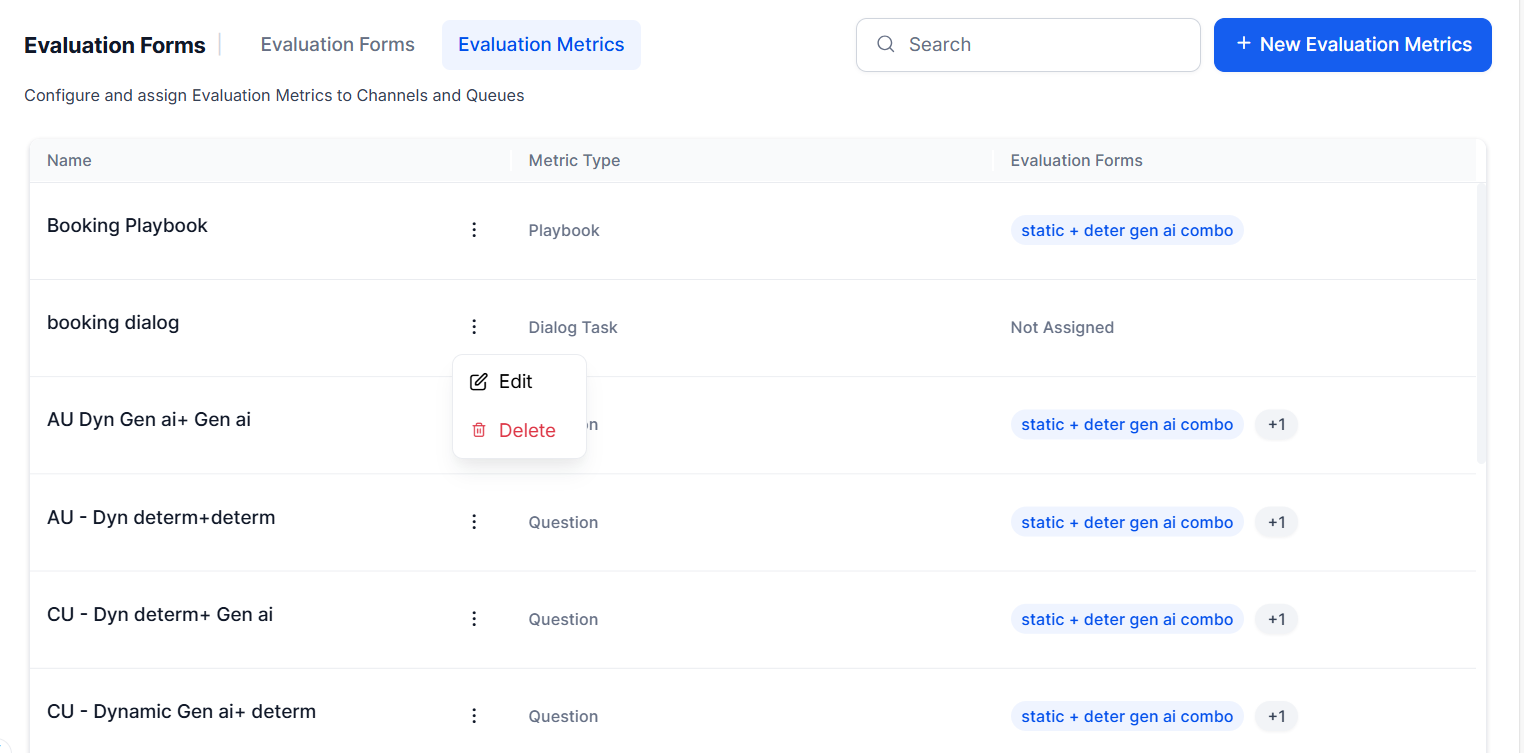 - Navigate to Quality AI > Configure > Evaluation Forms > Evaluation Metrics.