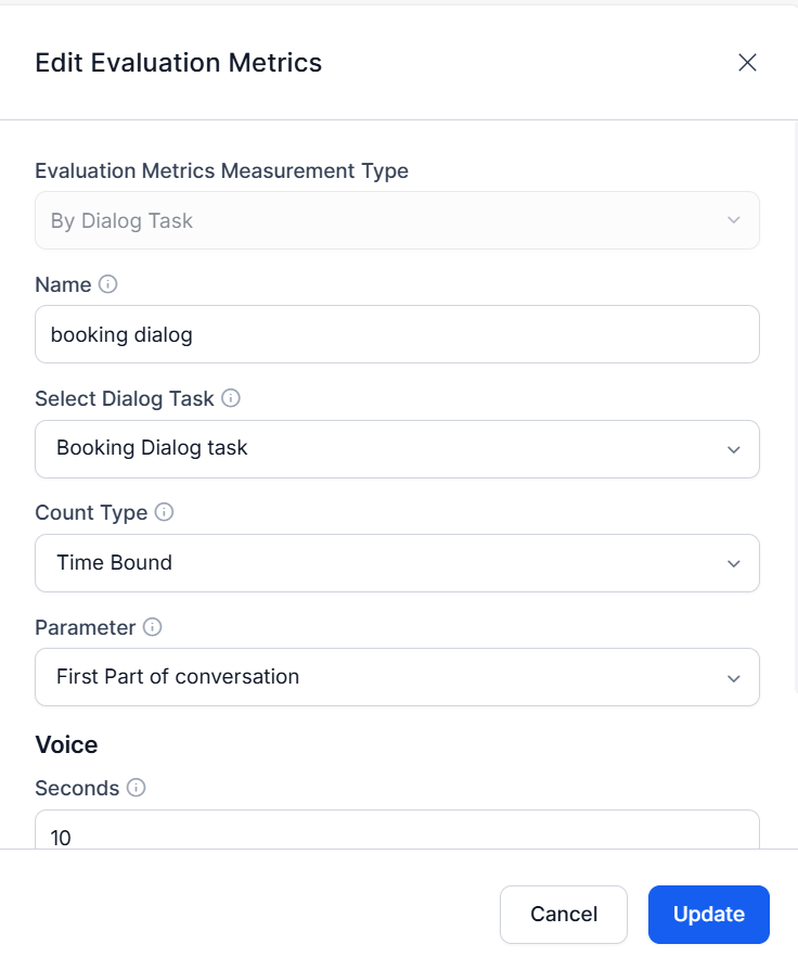 Voice: Enter the number of seconds from the start or end of the interaction to evaluate this metric.