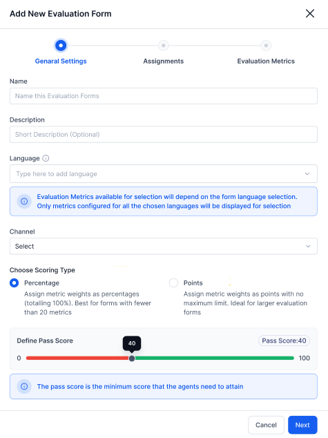 Channel-Specific Configuration: Supports customization of evaluation settings for Voice and Chat channels.