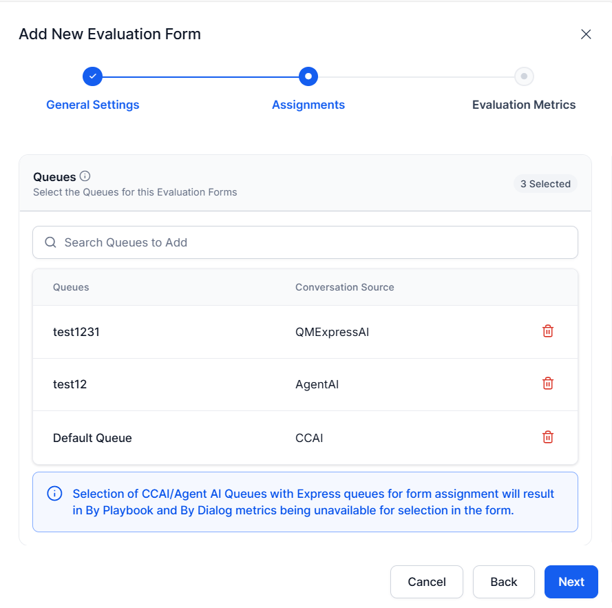 If you assign CCAI or AgentAI queues together with QualityAI Express queues in the same evaluation form, the system makes By Playbook and By Dialog metrics unavailable for selection.