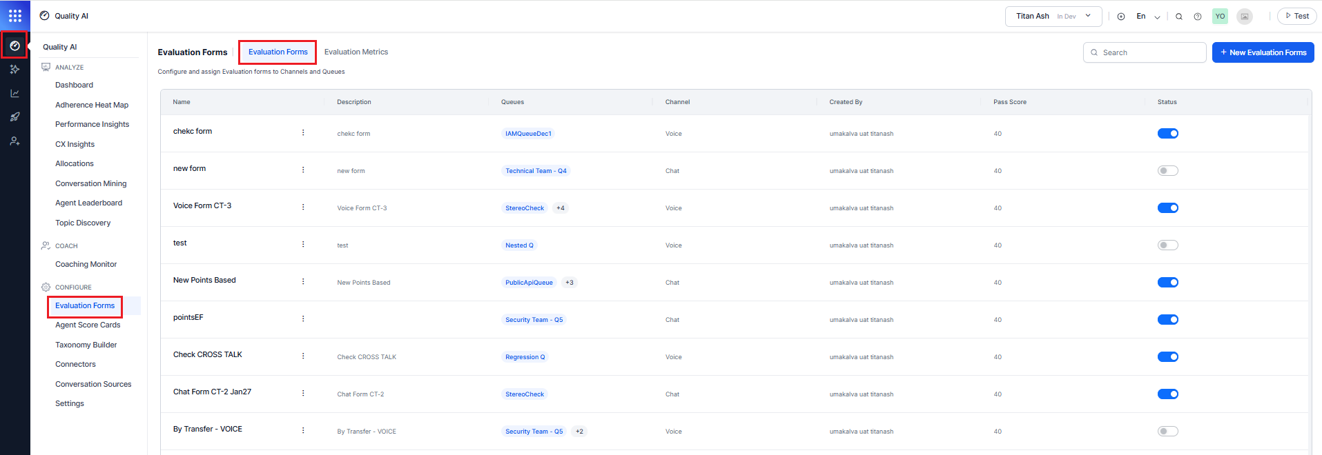 Navigate to Quality AI > CONFIGURE > Evaluation Forms to view and manage evaluation forms.