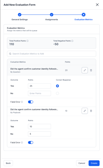 When you add evaluation metrics to a form, the system lists them in the Evaluation Metrics section. Each metric represents a quality parameter used to evaluate agent performance during audits or AutoQA scoring.