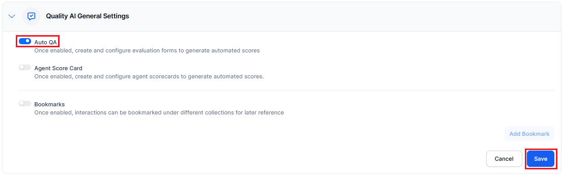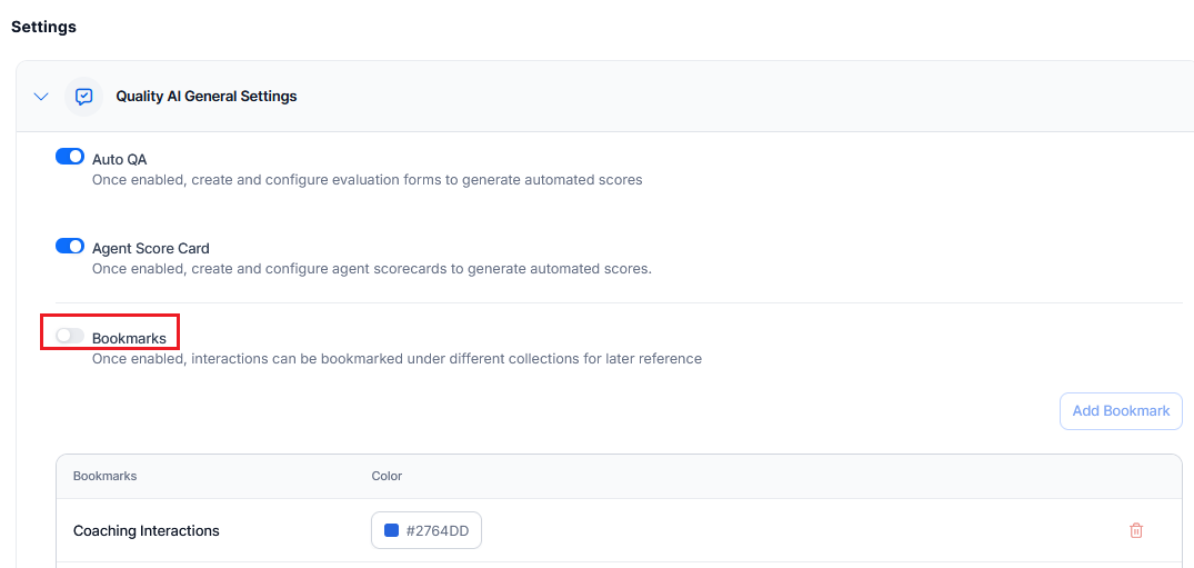 The Quality AI General Settings lets you configure and manage features that enhance agent performance and maintain compliance. You can set up agent scorecards, create evaluation forms, and use bookmarks to highlight key conversation points. These settings help improve customer interactions and streamline quality management.