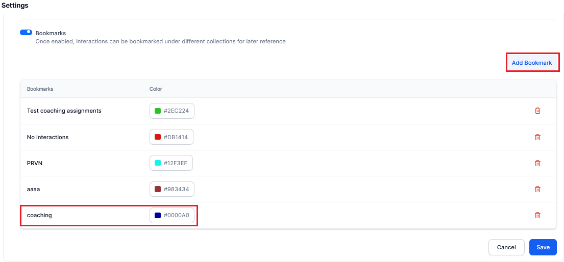 Bookmarks let you tag interactions (calls, messages) for easy reference in Conversation Mining and dashboards.