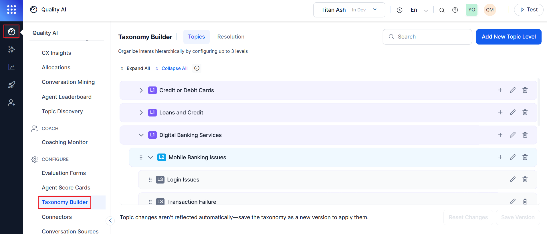 Taxonomy Builder lets organizations design and manage their topic hierarchy, so that conversation analysis reflects real business priorities rather than relying solely on machine-generated topic labels.