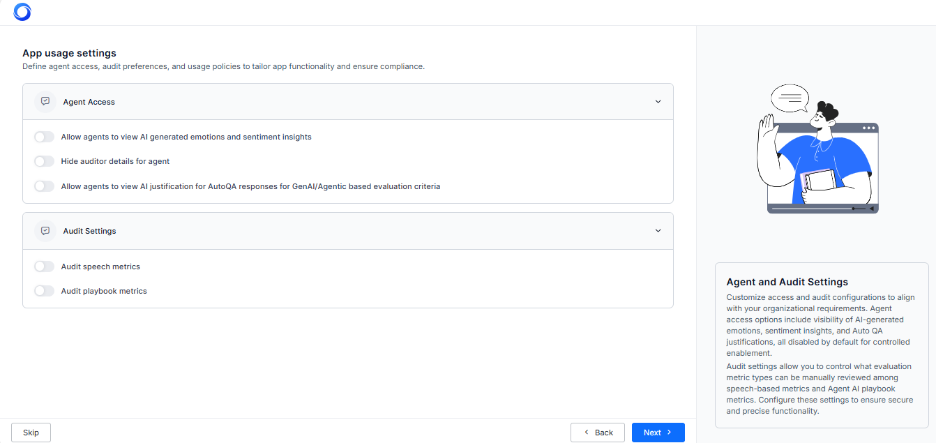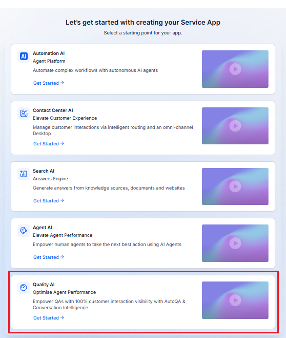 The Quality AI onboarding guides you through the process, from account access to application setup. It helps quality teams and analysts configure data sources, define evaluation criteria, and apply consistent scoring. This approach reduces manual setup and accelerates access to compliance metrics, quality insights, and performance reports.