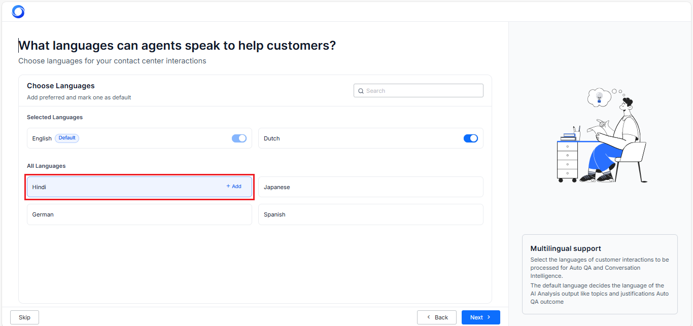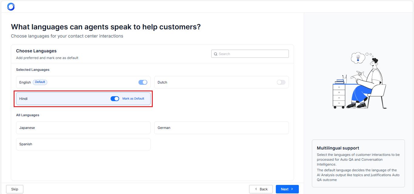 Select agent languages for customer assistance and AI-generated output (Topics, Justifications, QA outcomes).