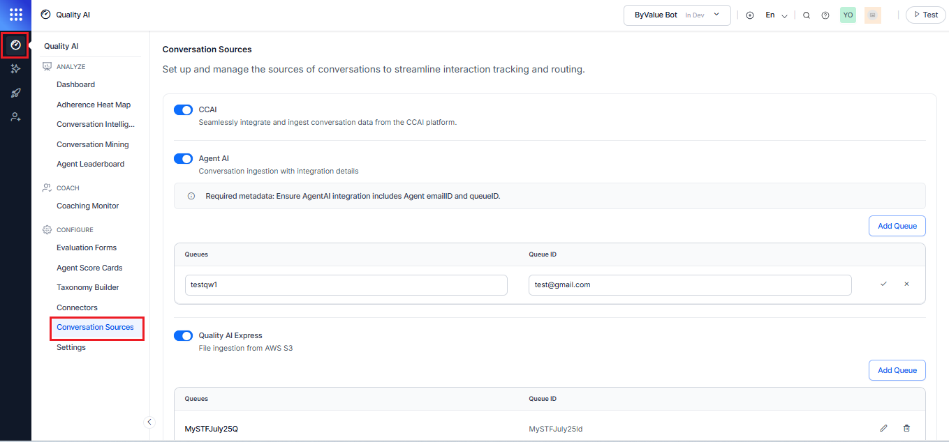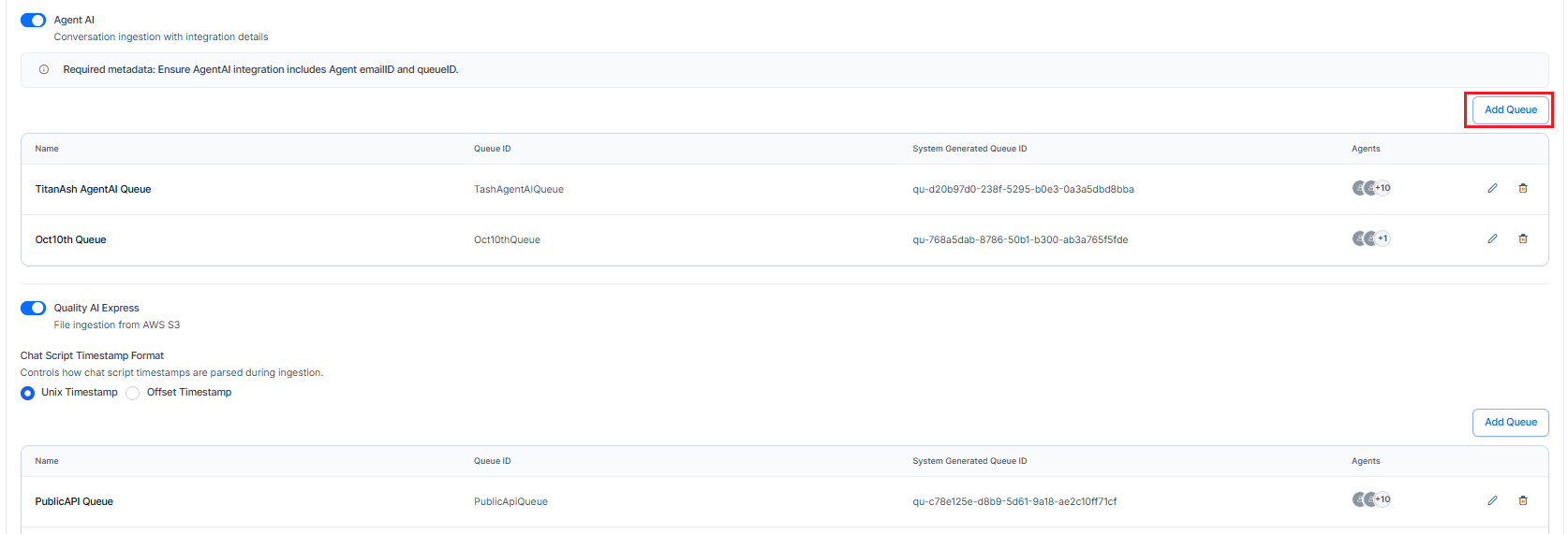 Configure queues for Agent AI and Quality AI Express sources to route conversations correctly. Queue configuration appears only for Agent AI or Quality AI Express deployments.