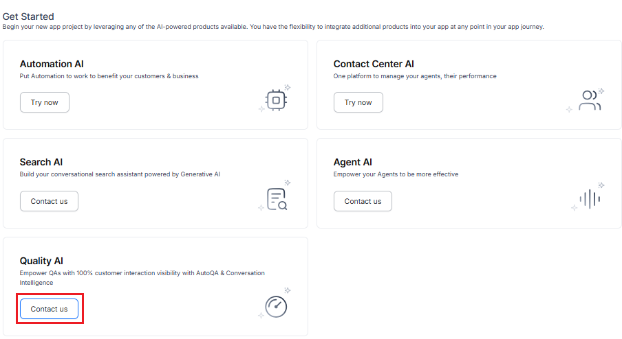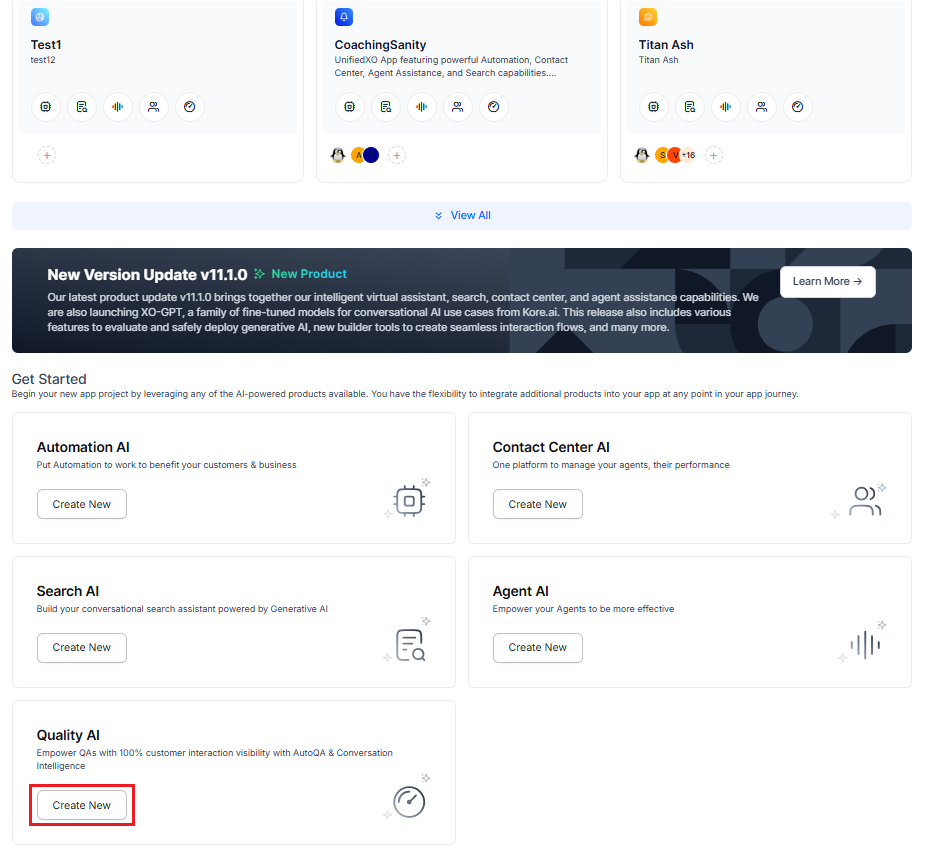 - Select Create New from the Get Started screen to manually create a new AI application. You select and enable products, such as Quality AI, during setup.