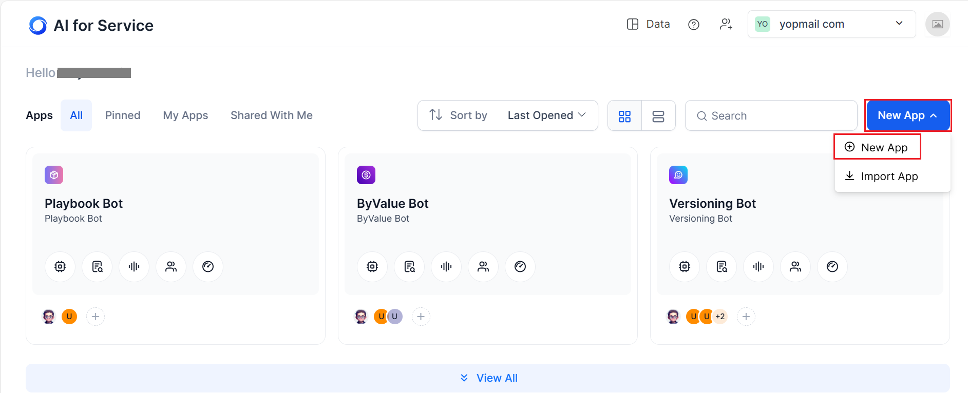- Select New App from the application dropdown menu to create a new Quality AI application. New App is available from the global app switcher and lets you create a new application at any time, regardless of your current product licenses.
