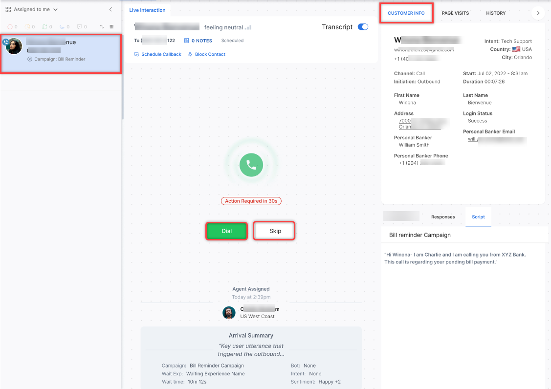 Campaign managers can read, fetch, and display column/field values from a CSV file whenever required. This can be done within the message node in the start flow or by sending the necessary values to the Agent Console during an agent transfer, ensuring these values are reflected in the voice campaign call. Learn more