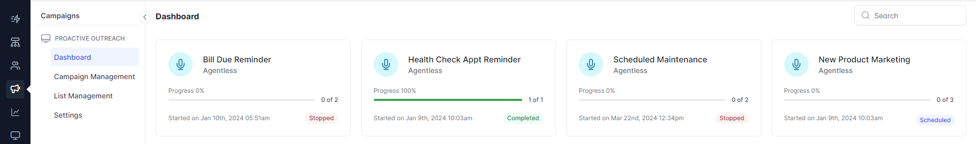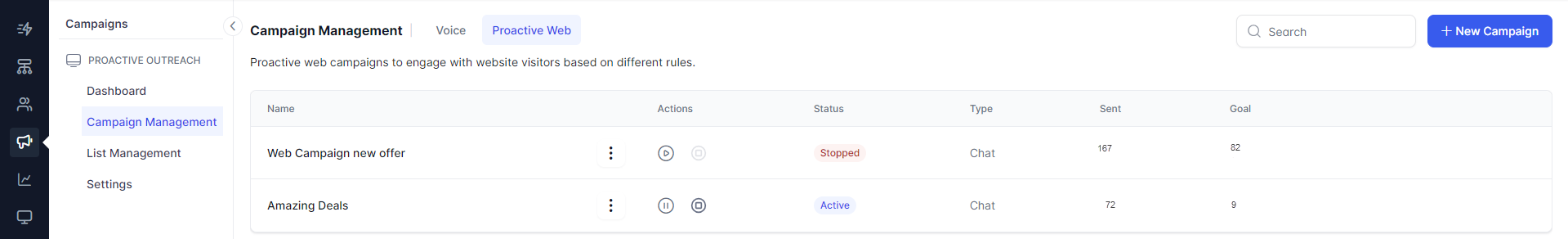 New Campaigns Module: The new Campaigns module simplifies and enhances outbound efforts across voice and web channels. It offers tools for creating targeted voice campaigns and proactive web campaigns, supported by easy-to-use templates and comprehensive analytics. This allows businesses to efficiently reach their audience, monitor campaign performance, and achieve their objectives with greater precision and effectiveness.
