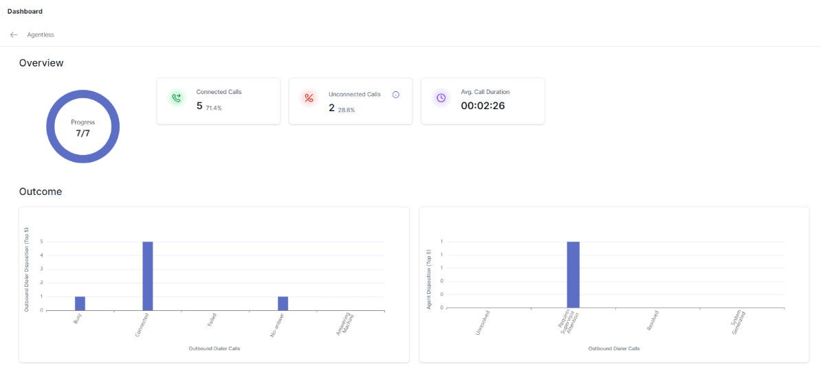 Agentless voice campaigns now support predefined disposition codes for tracking and analytics. The system attaches the selected disposition to the session as a tag and displays it in campaign outcomes and interactions. Learn more .
