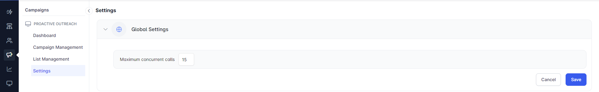 Settings: The settings allow campaign managers to decide the maximum number of concurrent calls that can be dialed.