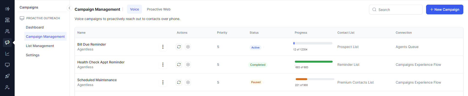 Voice Campaigns :Use the power of voice technology to connect with your audience through personalized messages or interactive experiences. Setting up a new voice campaign is easy—begin with a targeted contact list to ensure your message resonates with the right audience.