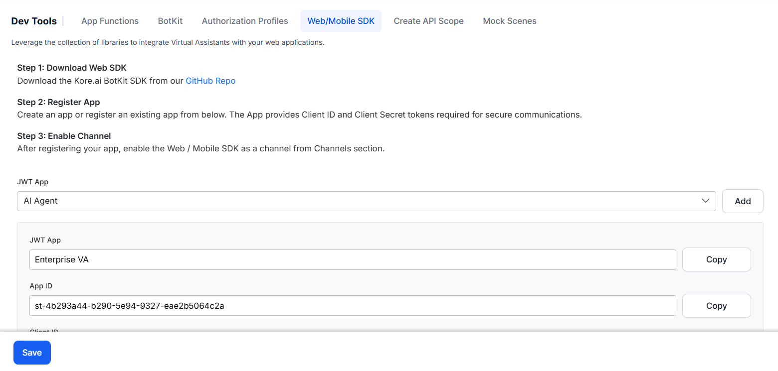- From the App Settings menu, go to Dev Tools > Web/Mobile SDK.