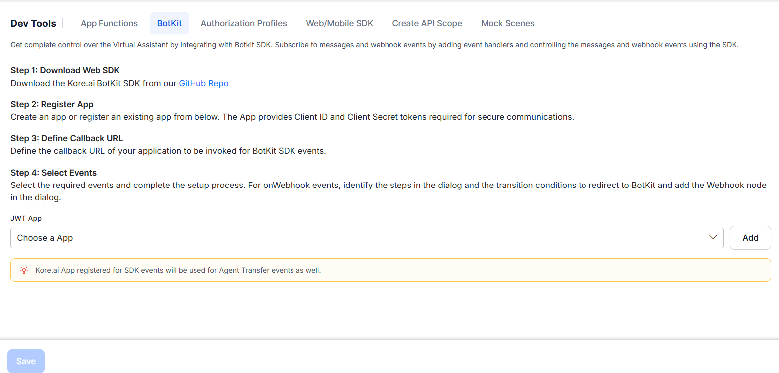 On the BotKit page, click the Add button next to the JWT App drop-down list. The Create JWT App dialog opens.